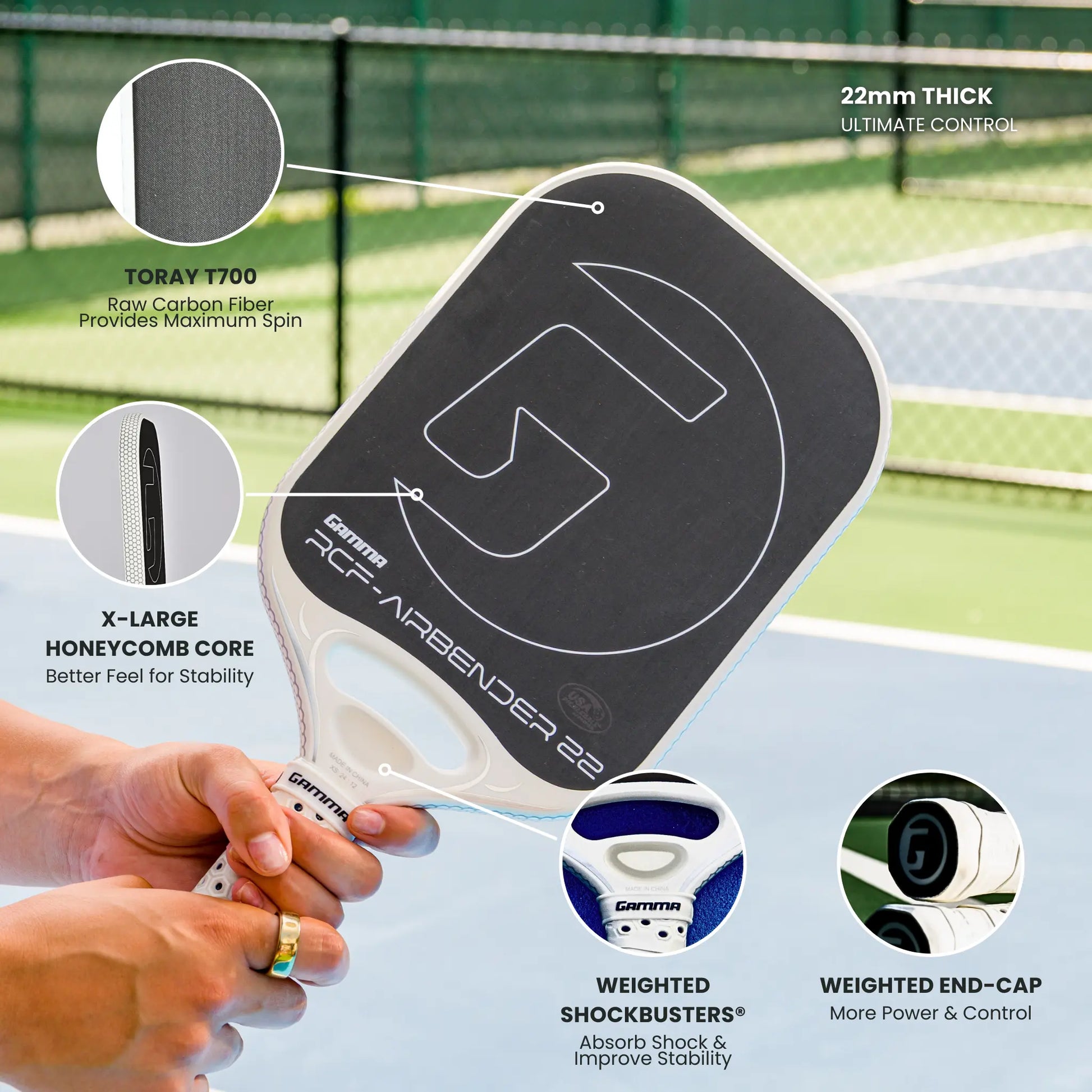 Crafted with Toray T700 Raw Carbon Fiber, the Airbender 22 generates maximum pickleball spin for superior shot placement. The high-density core ensures long-lasting durability, resisting compression even during intense play. For players looking to fine-tune their paddle’s balance, Shockbuster and End Cap weight kits allow customization at the throat and endcap, helping you achieve the perfect blend of power and control.