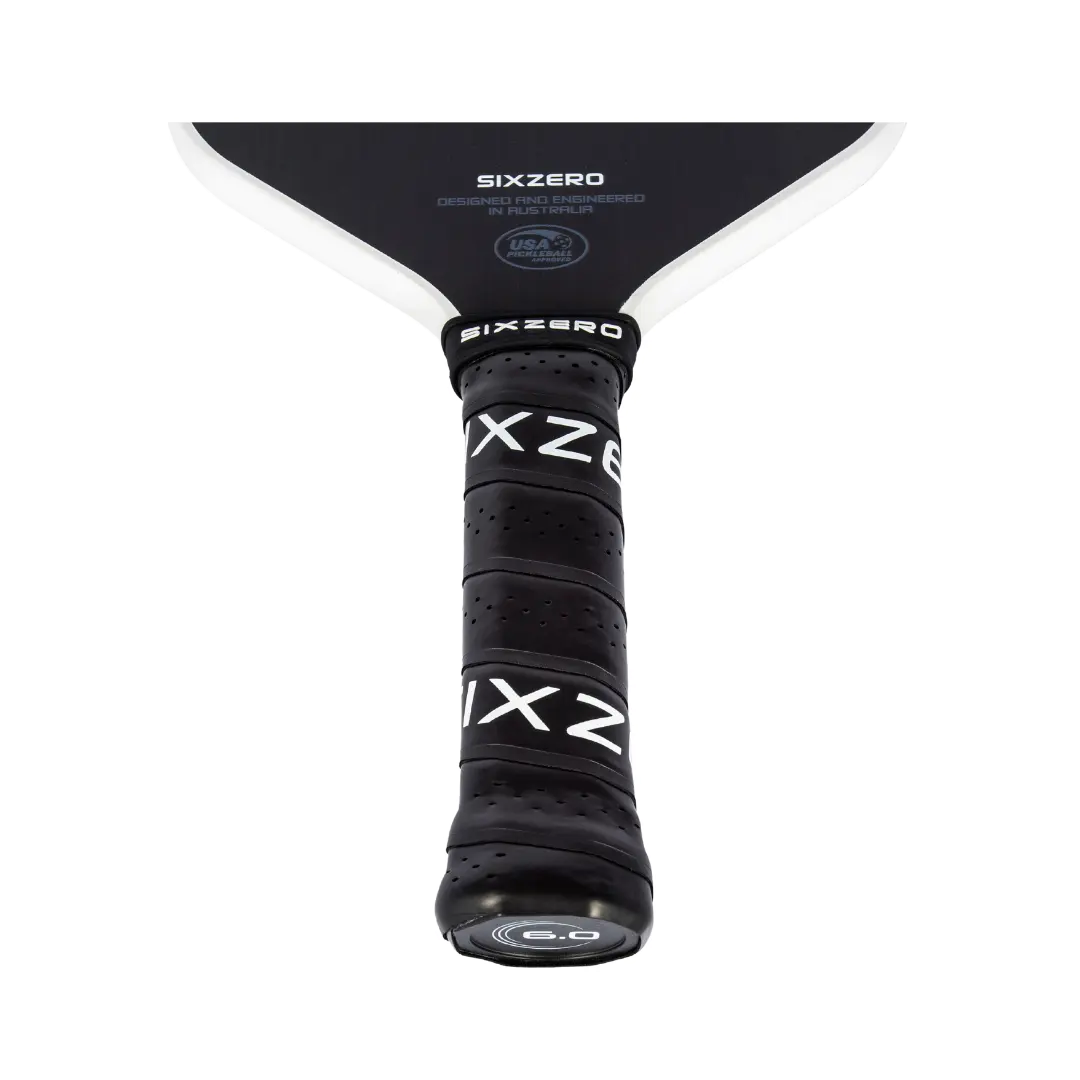 To maximize strength and performance Six Zero engineers have designed a 3D carbon forged handle. The carbon face and fusion edge technology extends down the full length of the handle and is forged together under heat and pressure – 3D carbon. The construction is designed to reduce vibration, ensuring comfortable play and a responsive feel. The design allows for optimal flex, improving the paddle neck sweet spot. A tapered neck and a 5.5” elongated handle accommodates for double backhand players. The handle is finished with a premium custom Six Zero perforated leather grip with a 4.25” circumference – suited to all sized hands.