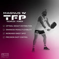The Magnus Pro IV pickleball paddle is equipped with an elongated paddle shape and shorter handle to let you play your game with added power and reach. An ideal paddle for players who utilize a one-handed backhand. By adding JOOLA’s patent-pending TechFlex Power (TFP) technology to optimally distribute weight throughout the paddle, you can increase overall play time and get real-time feedback to manage your game. Magnus Pro IV’s larger sweet spot allows for better accuracy and forgiveness on mishit balls. Time to electrify your game.